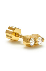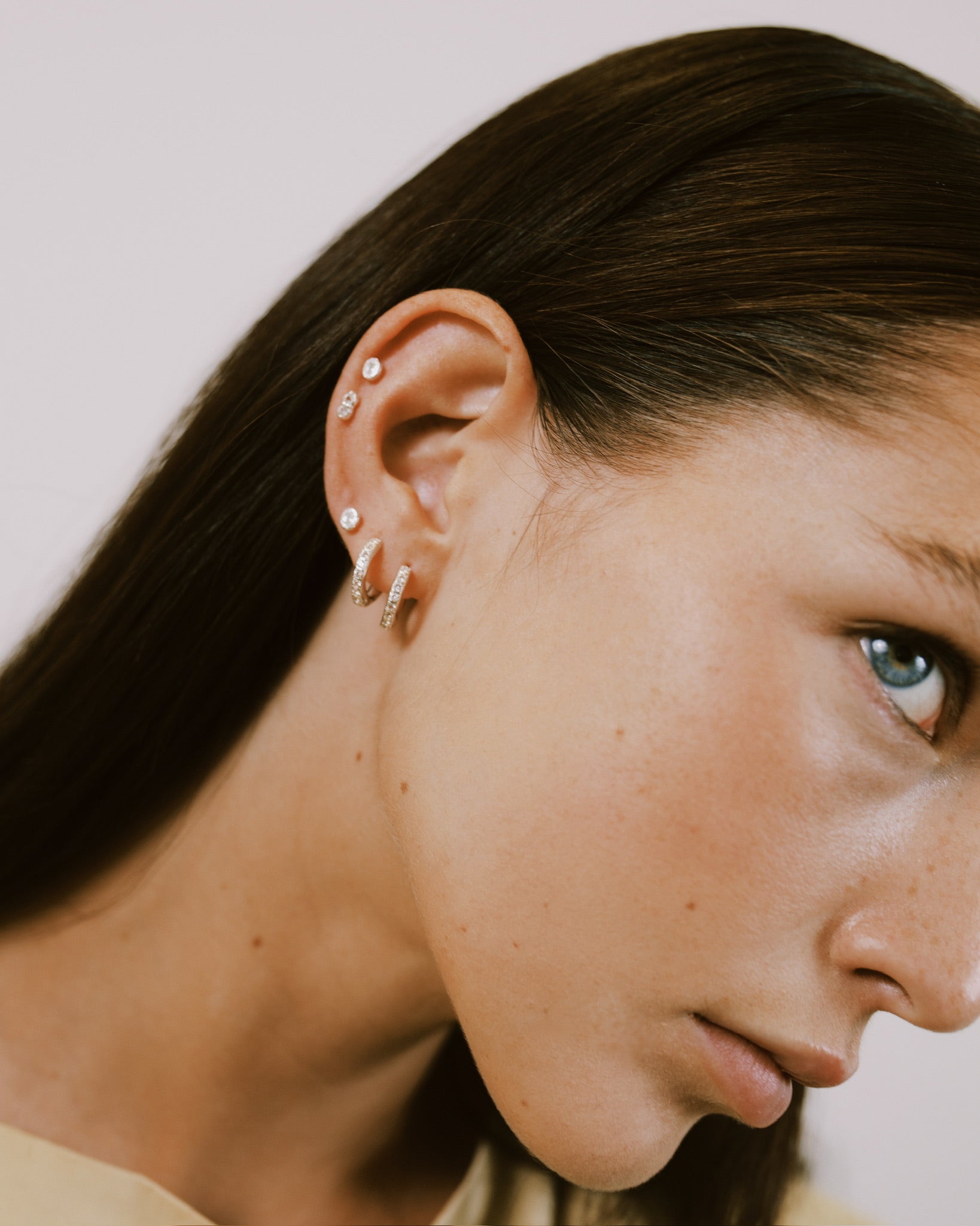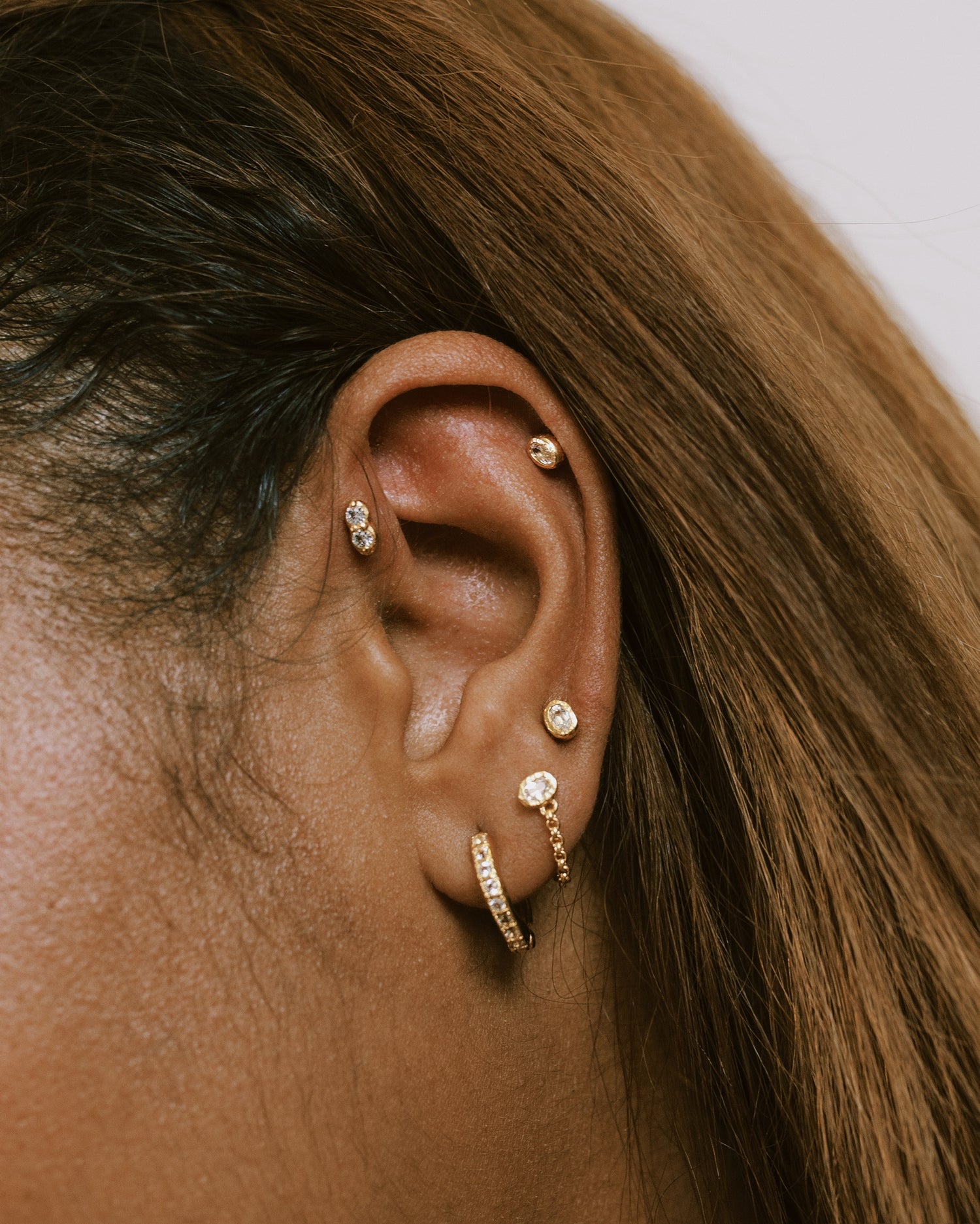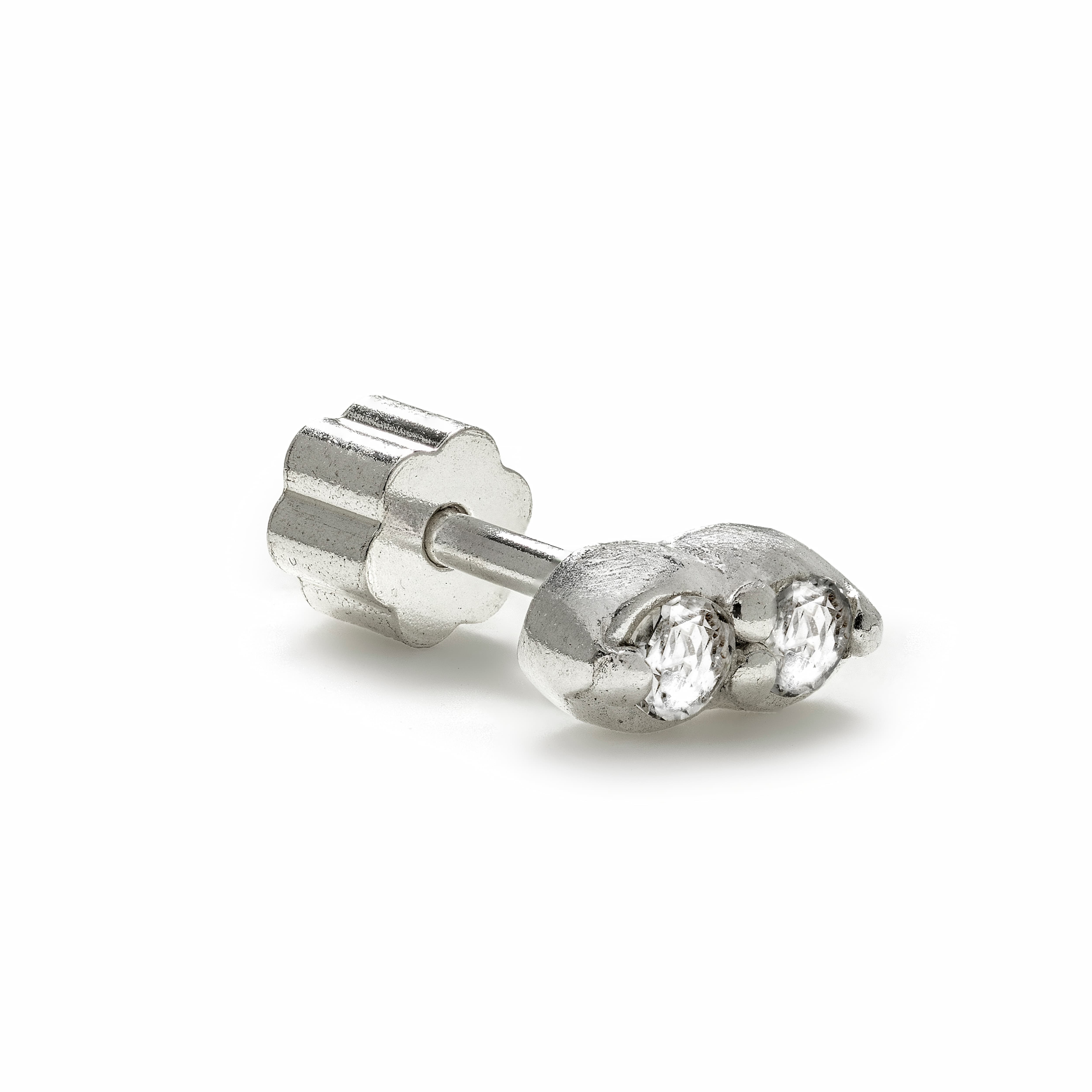 A refined stud earring featuring two tiny white topaz stones. Vayra has a flat back so its super comfy to keep on all the time. Perfect worn on its own or in a stack.